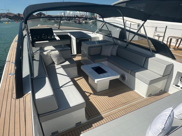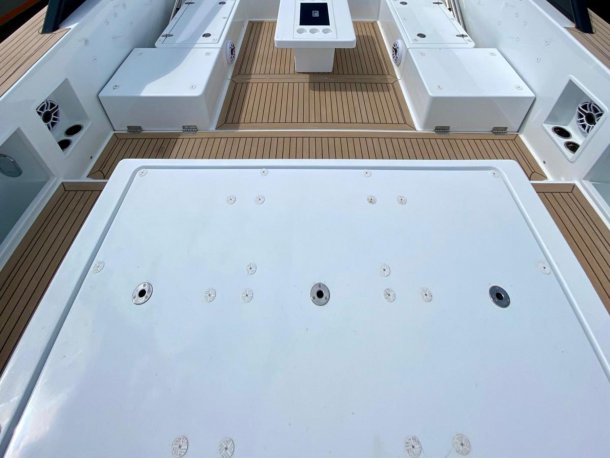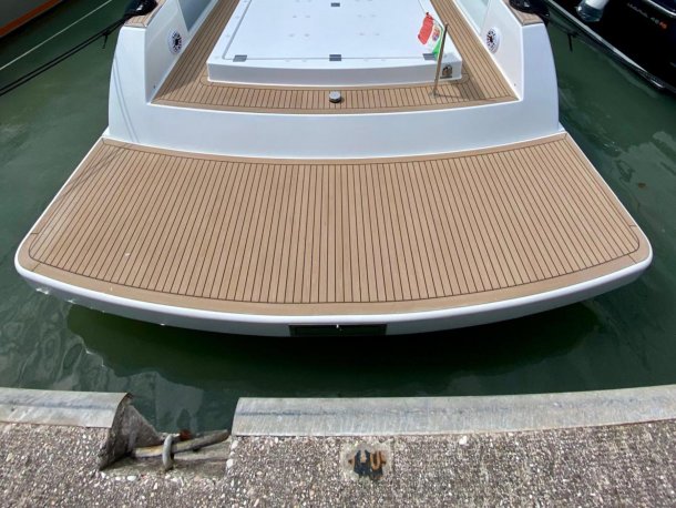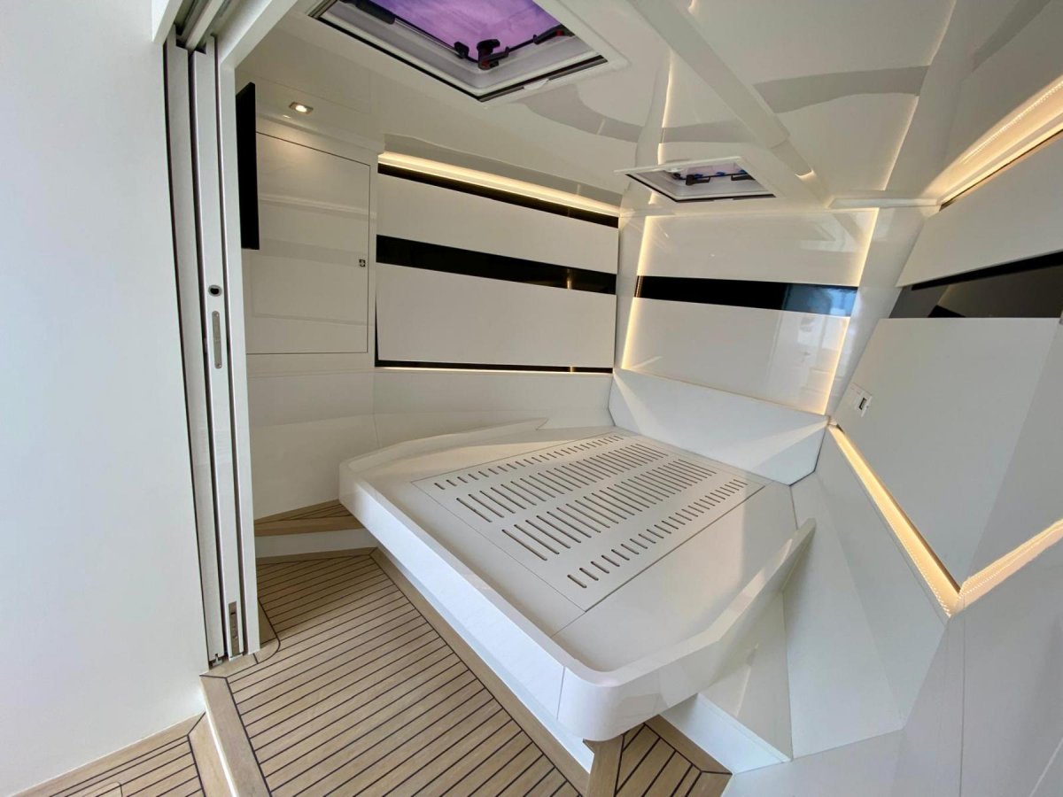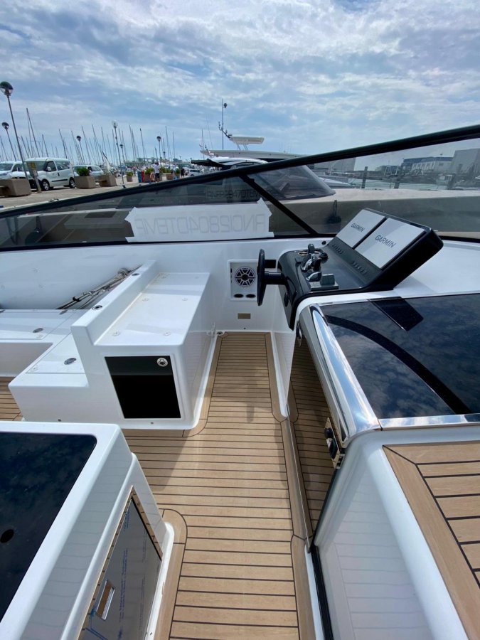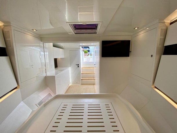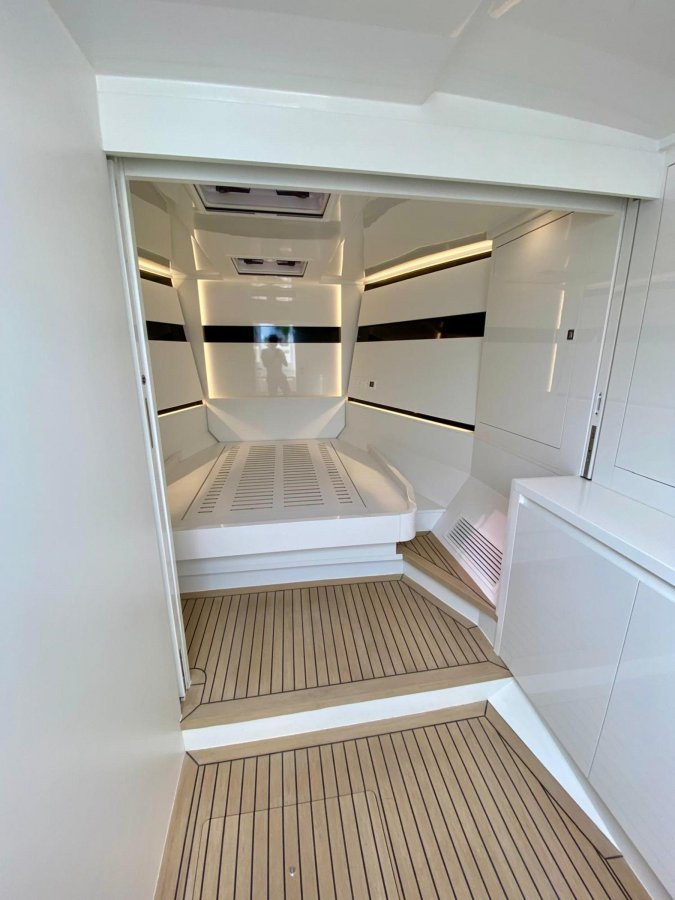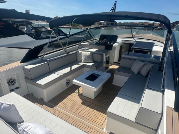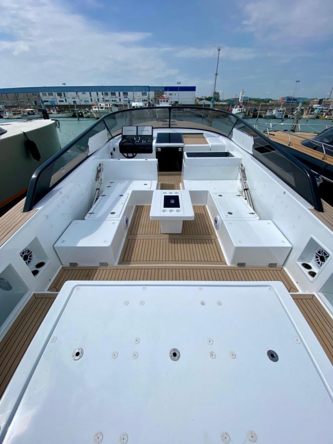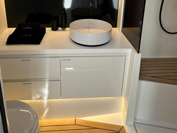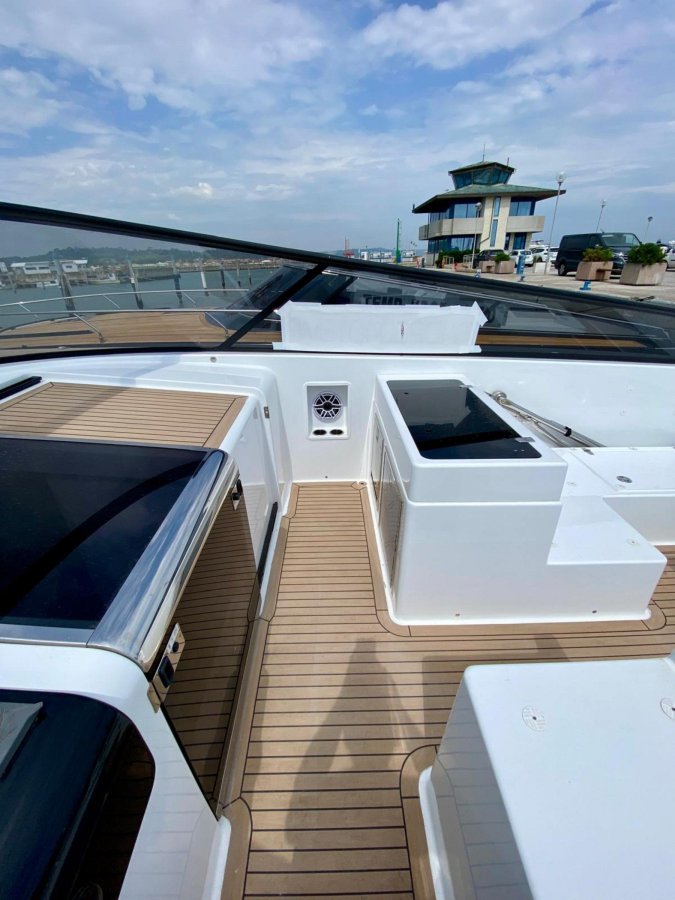 Haar scherpe, architectonische profiel en langgerekte boeg vormen een iconische aanwezigheid op het water, terwijl het uitgestrekte open-air dek een naadloze verbinding biedt tussen ontspanning en prestaties. Elke lijn weerspiegelt het kenmerkende DNA van het merk, waar verfijnde esthetiek en intelligente functionaliteit in perfecte balans samenkomen.