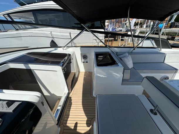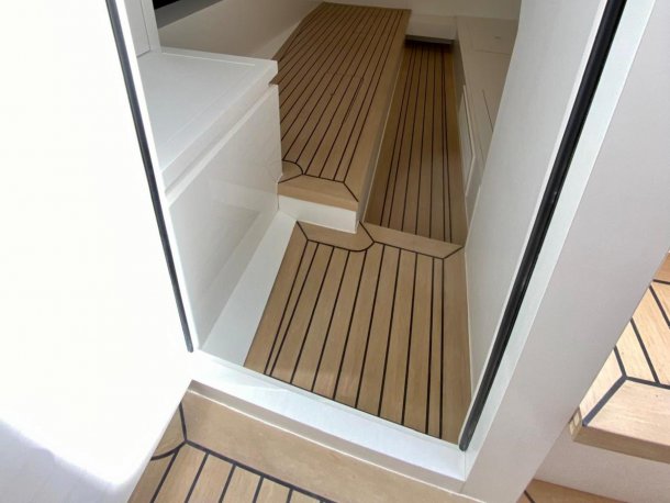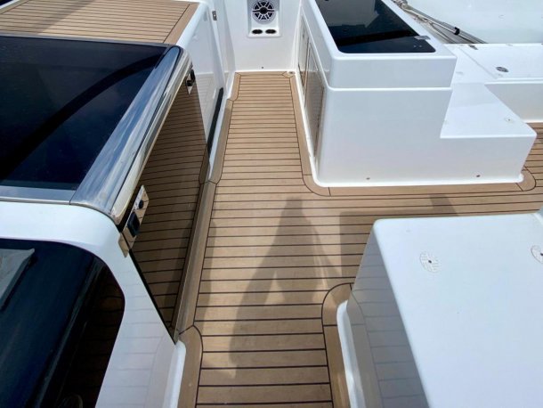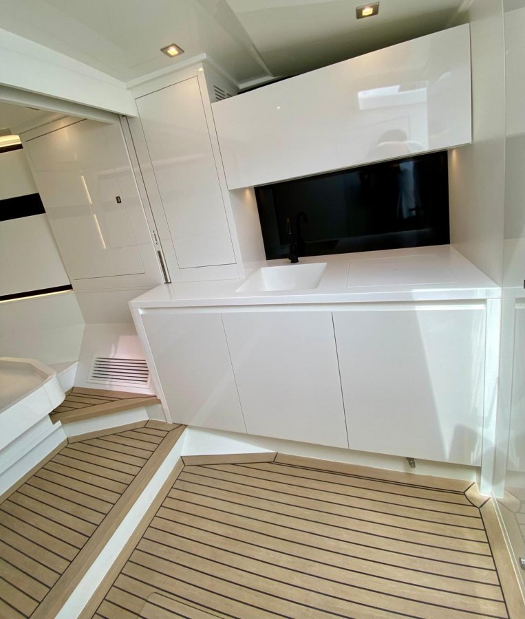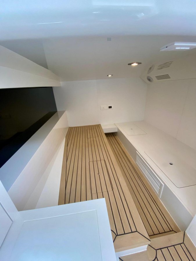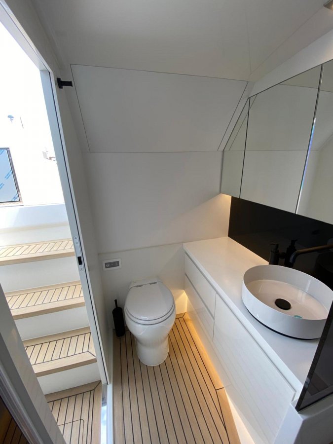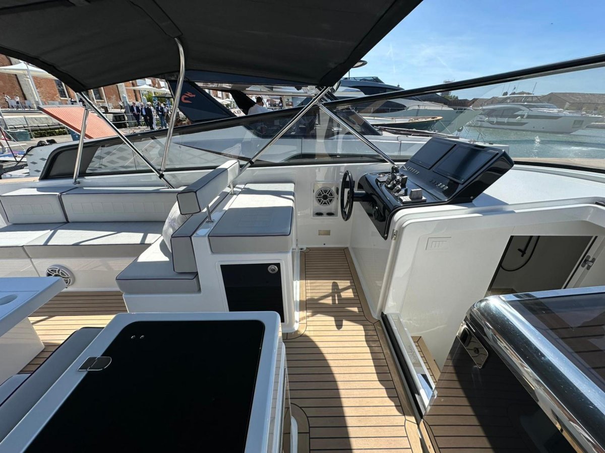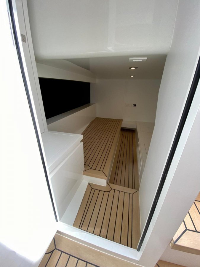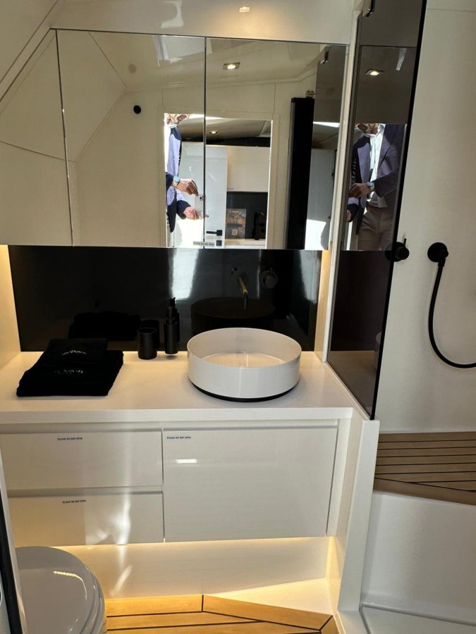 Haar scherpe, architectonische profiel en langgerekte boeg vormen een iconische aanwezigheid op het water, terwijl het uitgestrekte open-air dek een naadloze verbinding biedt tussen ontspanning en prestaties. Elke lijn weerspiegelt het kenmerkende DNA van het merk, waar verfijnde esthetiek en intelligente functionaliteit in perfecte balans samenkomen.