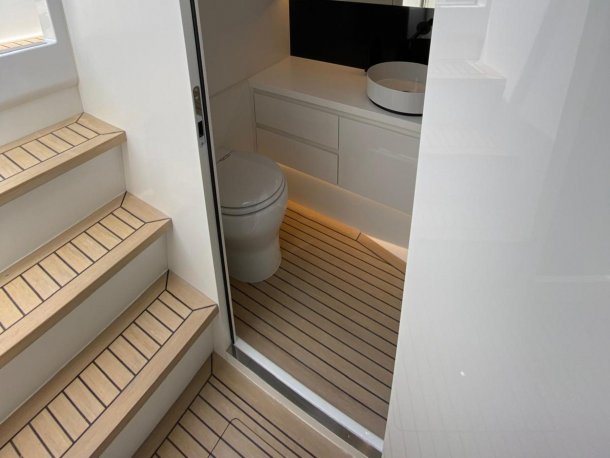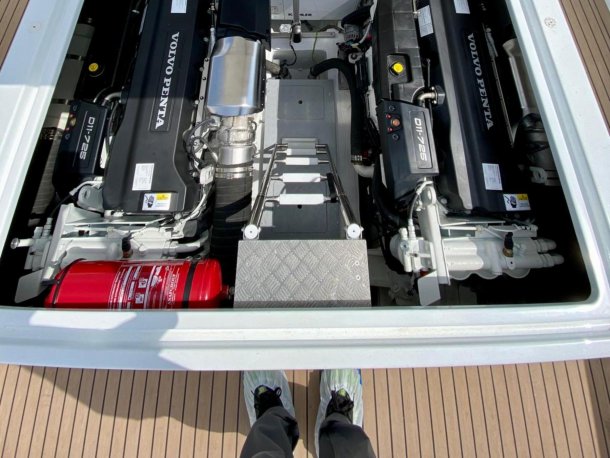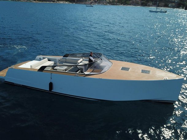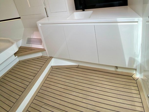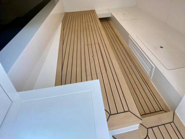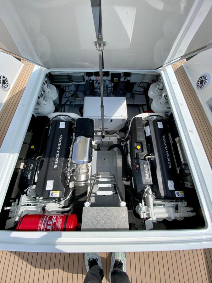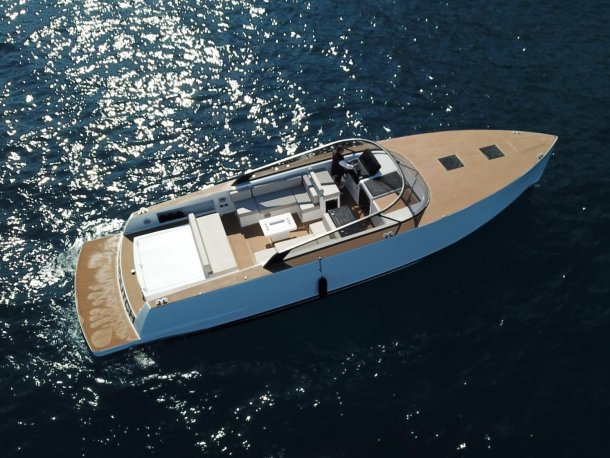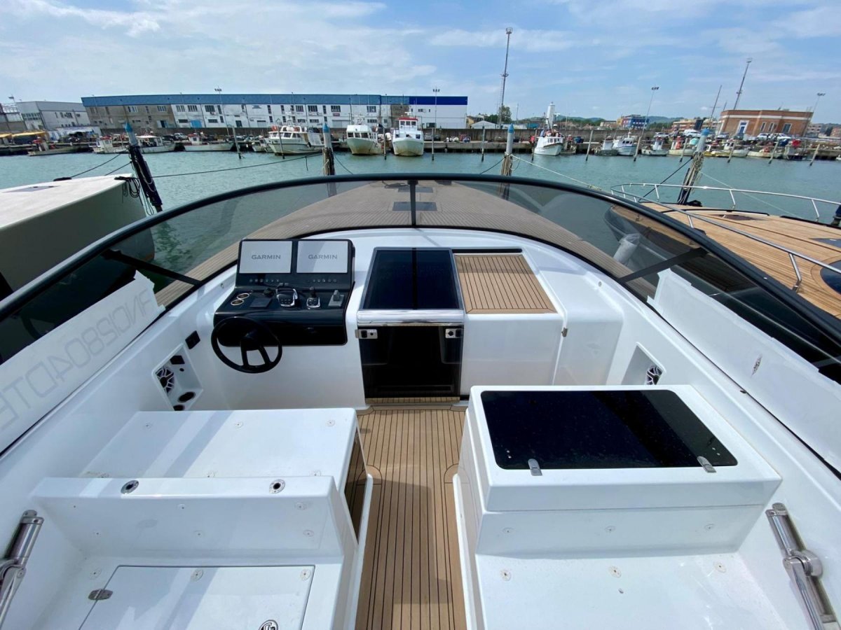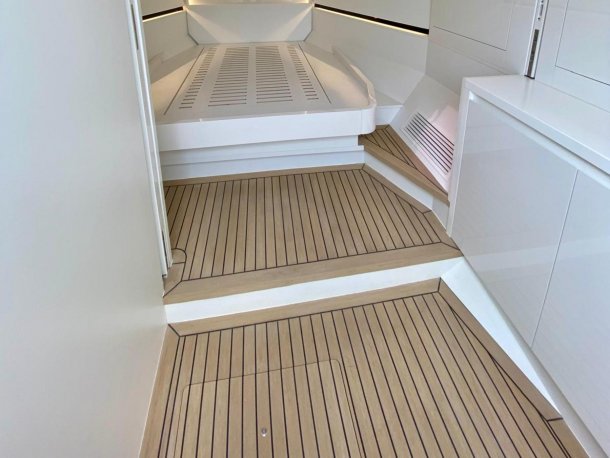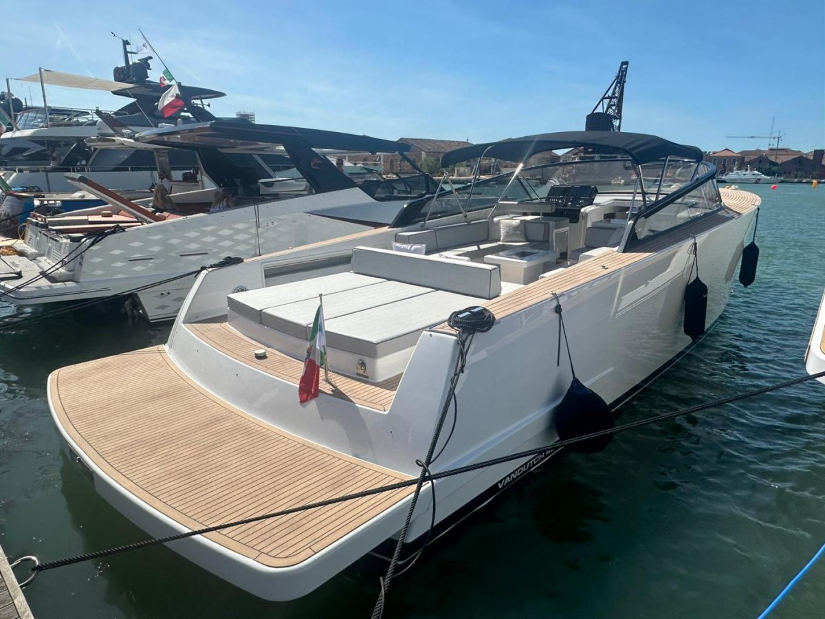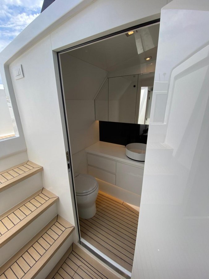 Haar scherpe, architectonische profiel en langgerekte boeg vormen een iconische aanwezigheid op het water, terwijl het uitgestrekte open-air dek een naadloze verbinding biedt tussen ontspanning en prestaties. Elke lijn weerspiegelt het kenmerkende DNA van het merk, waar verfijnde esthetiek en intelligente functionaliteit in perfecte balans samenkomen.
