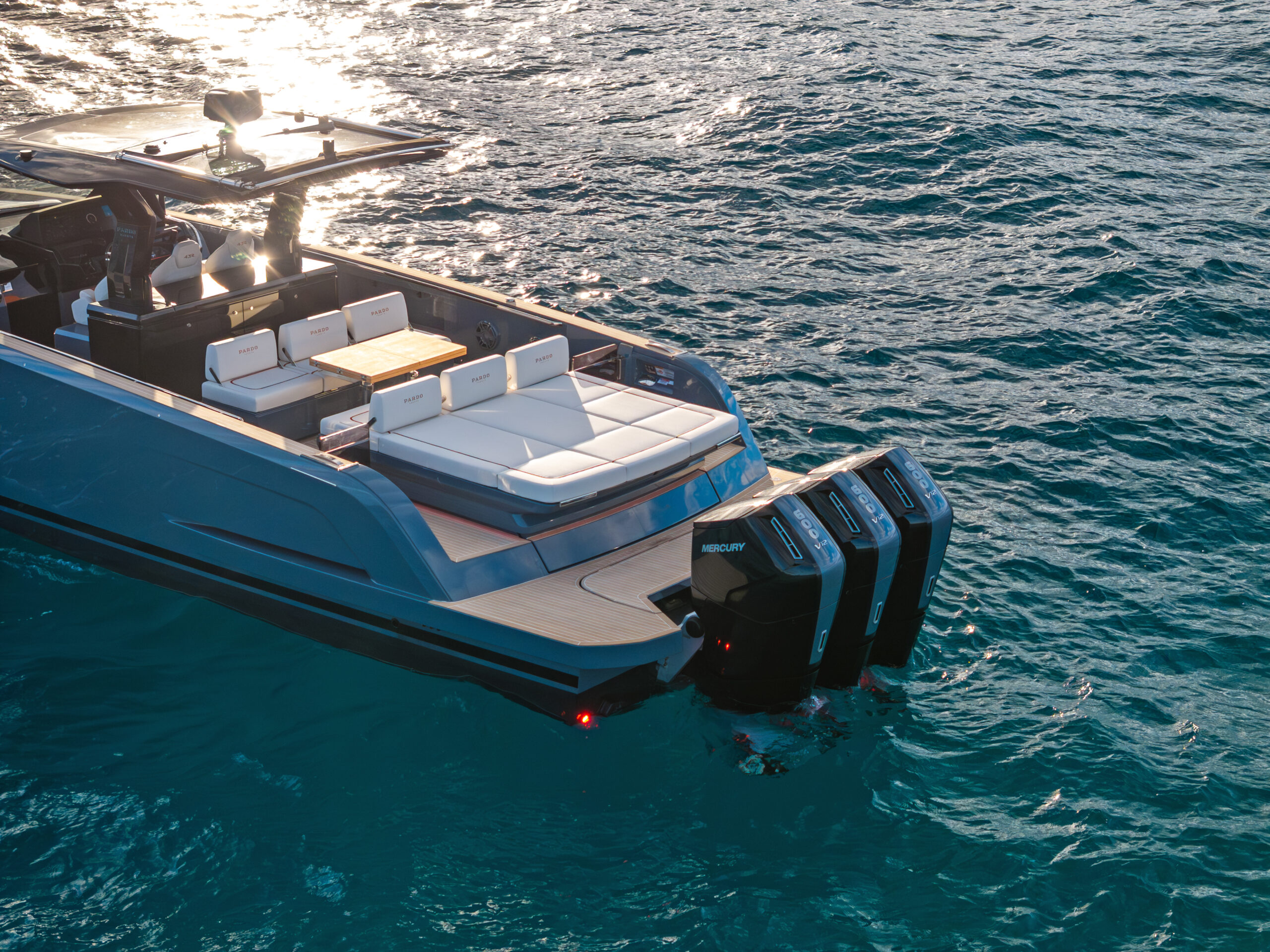 De Pardo 43 is bijna 13 meter lang en met toevoeging van het externe achterdek zelfs 14 meter. Hoewel het jacht door zijn krachtige Mercury outboard motorisatie en scherpe V-vormige romp een flinke snelheid tot 50 knopen kan bereiken, zorgen de interceptors ervoor dat de boot stabiel blijft op elke snelheid en ieder wateroppervlak.
